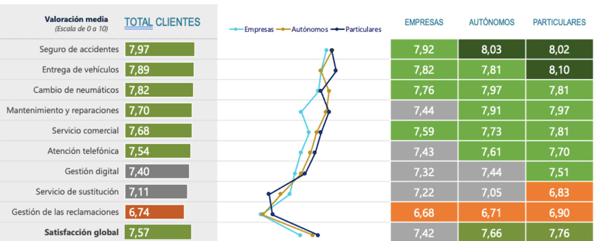 Los clientes de renting industrial valoran globalmente el servicio con un notable (7,65). Por tipología de clientes, los autónomos lo valoran con un 7,66 y las empresas, con un 7,42.
