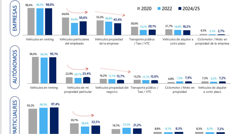 El renting es el principal medio de transporte laboral: el 75,4% de las empresas lo utiliza como primera opción y el 98% lo incluye entre los tres más habituales. Le siguen, a distancia, los vehículos en propiedad, y en tercer lugar, el transporte público y el alquiler a corto plazo.