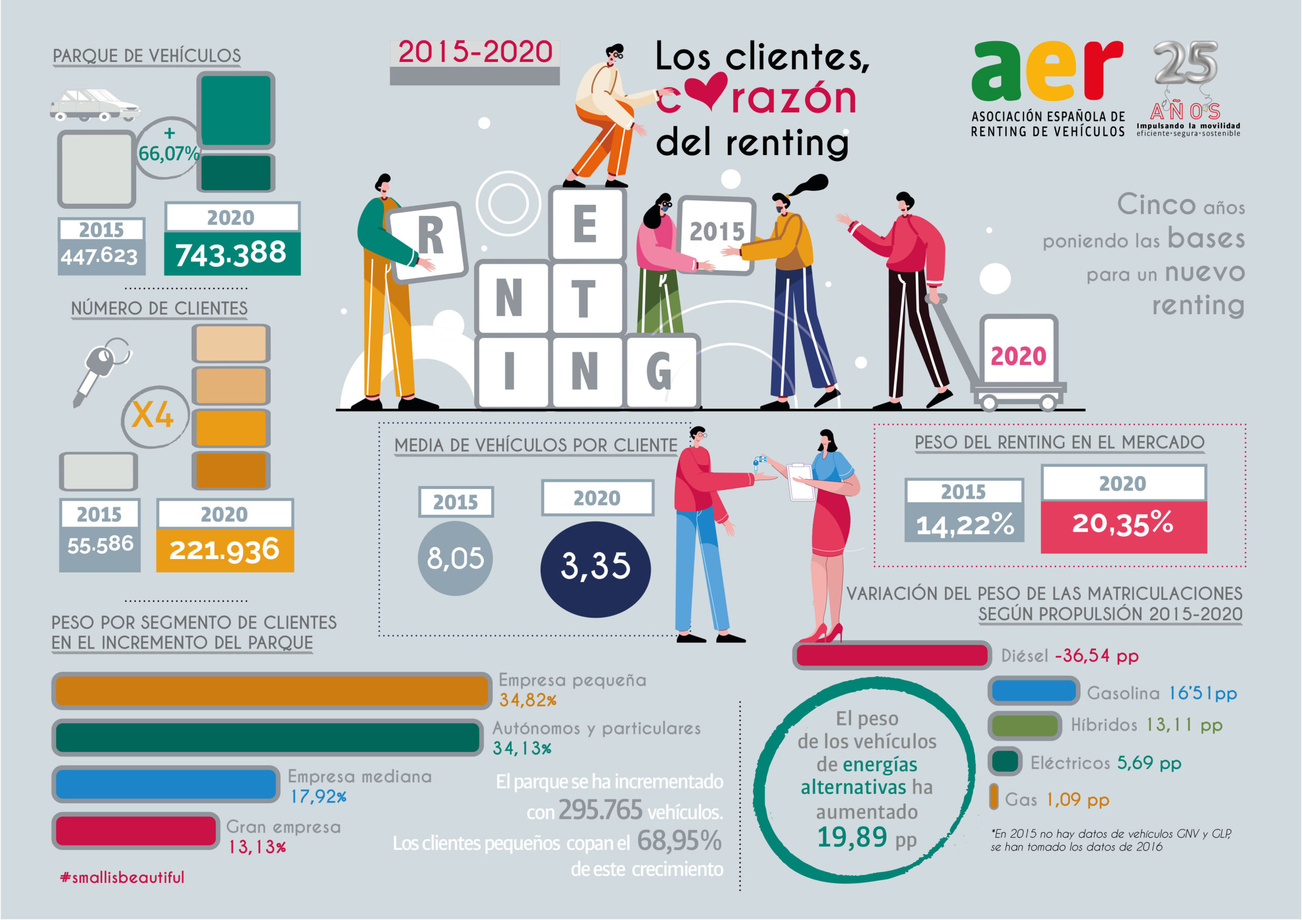 Los clientes de renting han aumentado un 299,27%, en el último quinquenio, es decir, los 55.486, de 2015, se han multiplicado por cuatro, lo que supone 166.350 nuevos clientes en renting, de los cuales el 96,35% son pequeñas empresas, autónomos y particulares. A cierre de 2020, se contabilizan 221.936 clientes en renting.