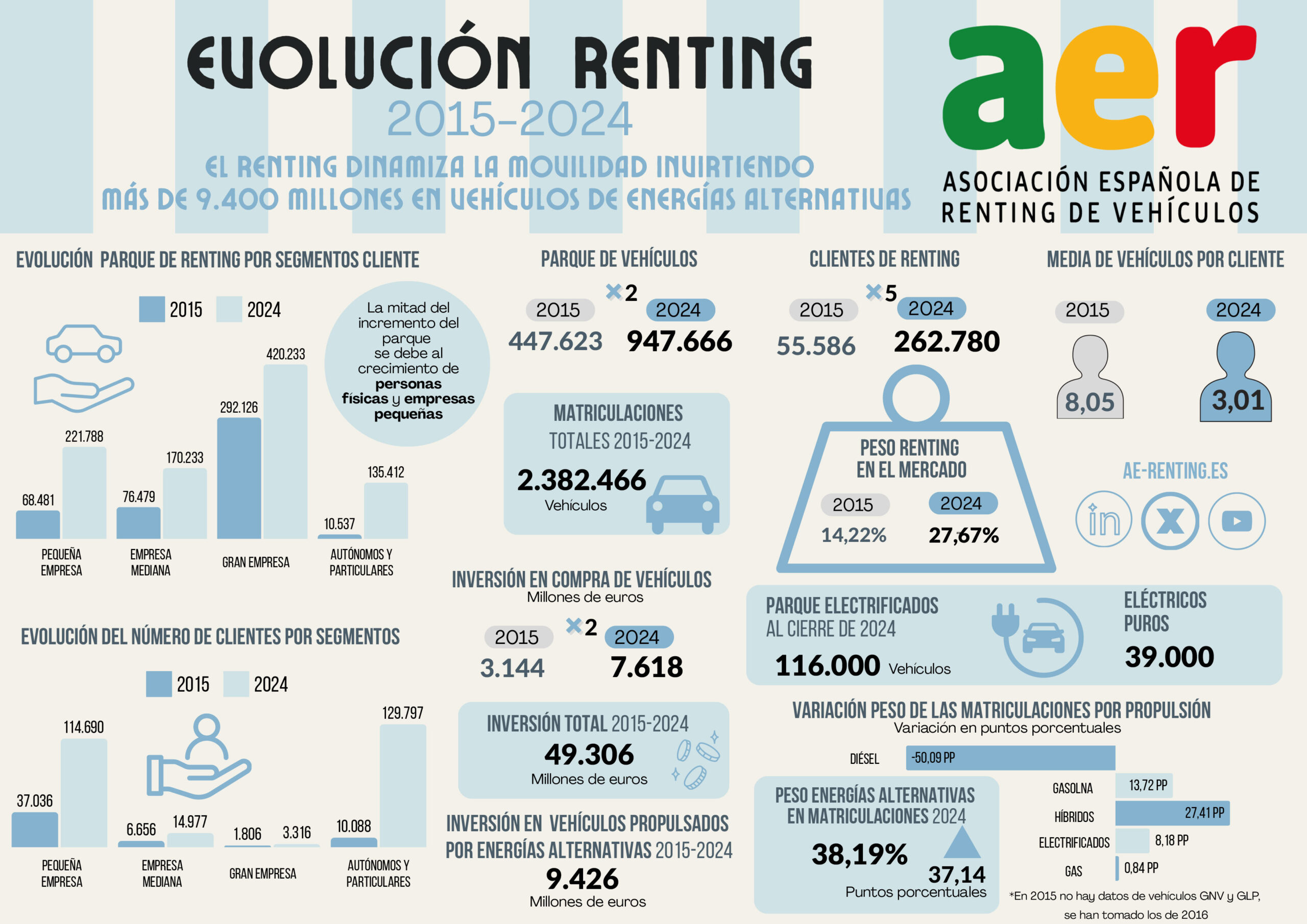 - El parque de renting en estos nueve años también se ha duplicado, pasando de las 447.623 unidades, en 2015, a las 947.666, en 2024