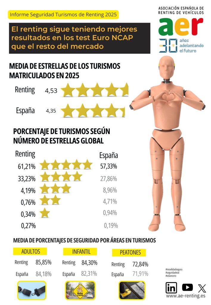 Madrid, 12 de febrero de 2026.— La Asociación Española de Renting de Vehículos (AER) ha publicado hoy el informe de los resultados en los test Euro NCAP de los turismos nuevos matriculados por el renting en 2025.