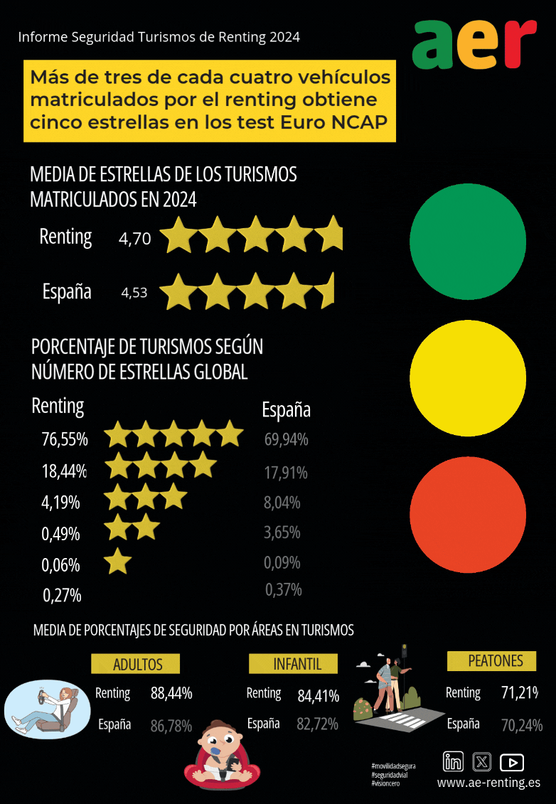 - El 76,55% de los turismos matriculados por el renting en 2024 obtiene cinco estrellas en los test de seguridad europeos, mientras el 69,94% del resto del mercado consigue esta puntuación