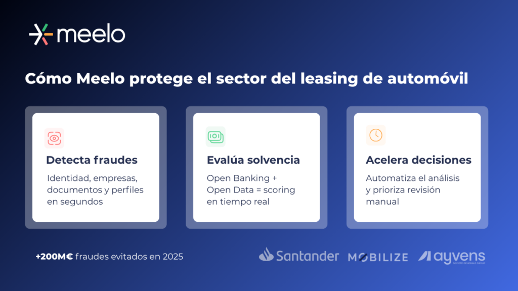 Como fintech especializada en orquestación de datos para procesos de onboarding y concesión, Meelo trabaja con entidades financieras y compañías de renting acompañando la mejora de sus procesos digitales, combinando prevención del fraude, análisis de solvencia y optimización de la experiencia de cliente.
