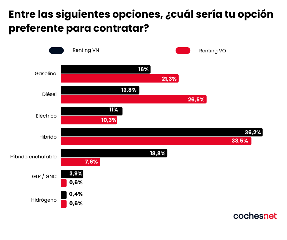 Además, los datos confirman el renting de VO como una excelente salida para el stock de motorizaciones tradicionales. Mientras que en el vehículo nuevo el diésel capta el 13,8% de la intención , en ocasión sube al 26,5% , siendo la segunda opción preferida tras los vehículos híbridos (33,5%).